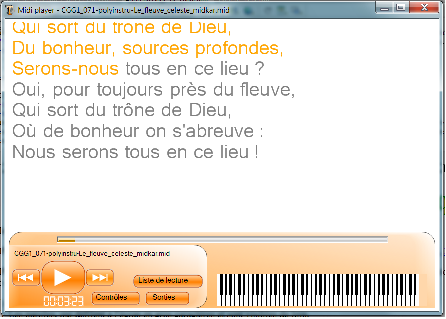 1) La musique des cantiques est jouée au moyen de la carte-son de l'ordinateur. Elle reproduit des instruments divers listés dans la fenêtre « Sorties » (voir image un peu plus loin dans la page).